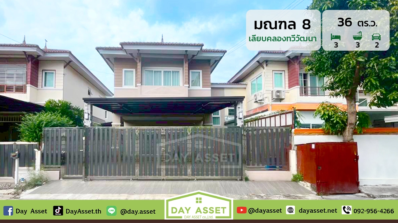 ขายบ้านแฝด 2 ชั้น หมู่บ้านมณฑล 8 เลียบคลองทวีวัฒนา : Monthon 8 Leab Klong Thawiwattana ทำเลดี พื้นที่ใช้สอยกว้างขวาง เชื่อมต่อถนนหลากหลายเส้นทาง เนื้อที่ 36 ตร.ว. ขายเพียง 5,390,000 ล้านบาท